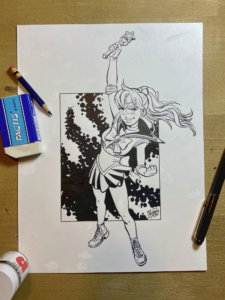 | Physical drawing commissions – blue pencil and ink on 2-ply Bristol board, black and white | |